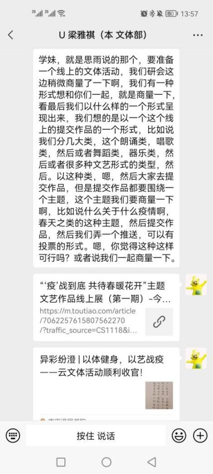 与研会策划线上文体活动的开展。3月21日开始,文体部积极与研会进行沟通,共同协商线上活动的大致想法,目前活动的方案与形式已有雏形,之后会继续完善。