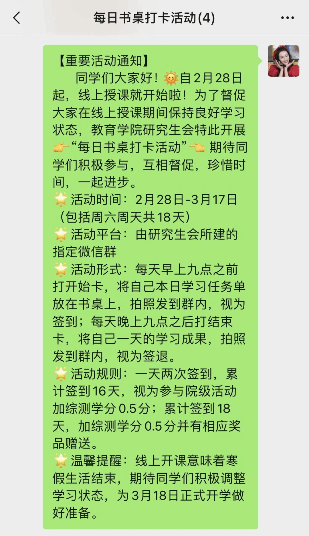 2.协助策划教育学院“每日书桌打卡”活动第一轮及第二轮,撰写活动通知以及推送稿。