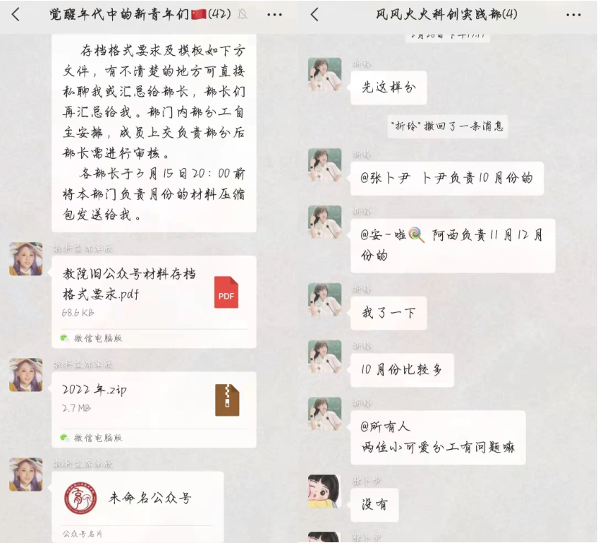 因学院公众号更换,研究生会需整理2021年旧公众号发出的推送,由宣传部统筹负责。我部首先汇总了年度总发出的推送数量,按照各部门人数分配任务。其中五月份的推送由我部进行整理,所有部门整理结束,汇总至我部进行最后的整合,并发送给学院新旧公众号汇总的负责人。