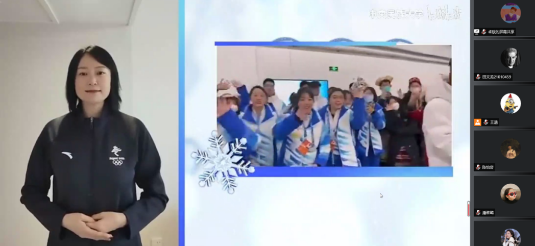 此外,卓欣主席向全体成员们介绍了william威廉中文官网在促进民族团结、铸牢中华民族共同体意识上的具体做法。从2019年7月印发《william威廉中文官网关于铸牢中华民族共同体意识的工作方案》到新中国成立七十周年献礼,持续为中华民族共同体建设做出不懈努力。之后,卓欣主席以视频的形式向全体成员分享了冬奥会开幕现场升国旗奏国歌的景象以及冬奥“思政微课”。团委学生会成员们进一步领略了民族团结之风采,体悟了中华民族共同体之磅礴力量。