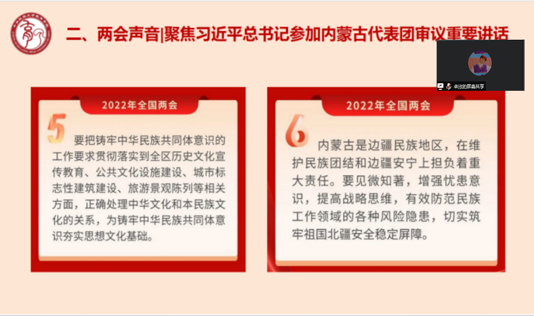 接下来,卓欣主席聚焦习近平总书记参加内蒙古代表团审议重要讲话,带大家回顾了两会声音。今年全国两会期间,习近平总书记参加内蒙古代表团审议时的重要讲话、政府工作报告、《中华人民共和国地方各级人民代表大会和地方各级人民政府组织法(修正案)》,都强调要铸牢中华民族共同体意识。我国是统一的多民族国家,国家的繁荣兴旺和社会的幸福稳定离不开各民族的团结和谐。