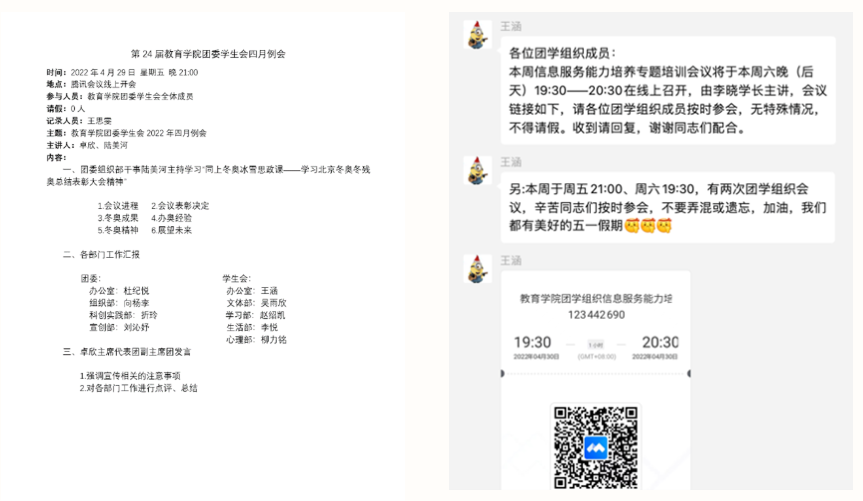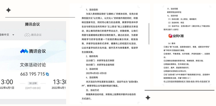4月1日,本科文体部与研会文体部召开线上活动讨论会,确定教育学院线上文体活动内容为创意短视频和线上K歌。经过协调沟通,本科文体部主要负责创意短视频活动的相关工作。