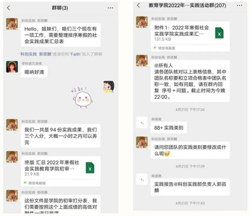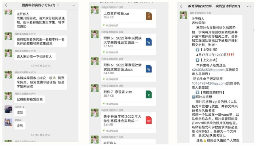自4月14日收到校团委通知并在明确各项要求后,部门负责人及时与院团委书记、副书记协商部署学院成果回收工作。4月15日至17日,2022年寒假社会实践成果回收工作正式开始,团委科创实践部部长折玲对寒假社会实践成果回收的要求以及相关注意事项整理并发布于教育学院2022年寒假社会实践群中,并由部门成员赵佳晶和马阿西分别负责硕士研究生及本科生实践成果收集整理工作,本次成果回收93份,一支团队因疫情原因未能顺利结项;17日-21日,部门负责人将上交成果进行编码整理,并将编码成果同教育学院2022年寒假社会实践初审评分表一并上交至团委书记王小婉老师处,由老师将成果发送至三位评审老师进行学院初审打分,确保我院初审评分工作公平公正的开展。按照校团委入选作品为7.8%的要求,我院共有8支团队入选;21-24日,部门积极拟定我院初审成果公示文稿,进行为期三天的成果公示并对初审结果进行汇总整合;4月25日,由部门负责人按照通知要求将我院所有上交材料打包发送至校团委,至此,教育学院2022年寒假社会实践成果回收及学院初审评比工作顺利完成。