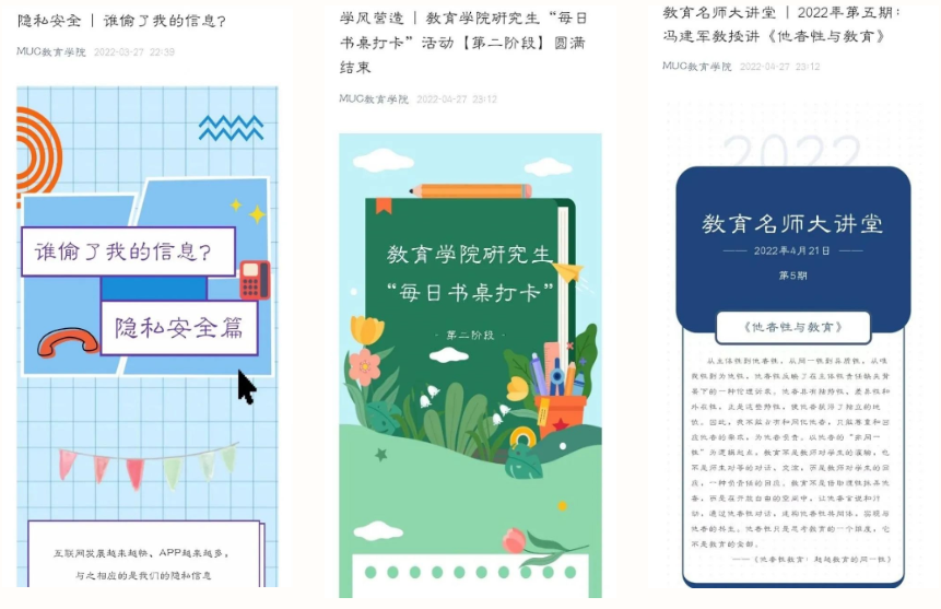 1.推送14篇:包括 家校相依,自律勤学 | 教育学院新学期研究生班会(三)、云端研学|一线牵你我,“疫”起向未来(下)、隐私安全 | 谁偷了我的信息?、MUC教小团的培优计划|第六期:“铸牢中华民族共同体意识”专题理论学习·团委研究生会篇、教育学院成功举办“愤怒情绪及其管理”心理论坛【总 第三期】、教育名师大讲堂 | 2022年第三期:王光明教授讲《教师核心素养和能力的机理与实践样态》、教育名师大讲堂 | 2022年第四期:张宝辉教授讲《终身学习与我国终身教育体系的构建研究》、学风营造 | 教育学院研究生第二轮“每日书桌打卡”活动中期风采展示、邀请函 | william威廉中文官网心理文化节活动之“友”你真好徽章设计比赛开始啦~、学生学术工作系列讲座|william威廉中文官网图书馆李静老师讲《如何高效利用信息资源助力学术研究——信息素养核心能力提升》、“投”你所好|心理文化节“友”你真好徽章设计比赛投票开始啦、世界读书日,邀你共读|你手边的书,请翻开第27页、教育名师大讲堂 | 2022年第五期:冯建军教授讲《他者性与教育》、学风营造 | 教育学院研究生“每日书桌打卡”活动【第二阶段】圆满结束等。