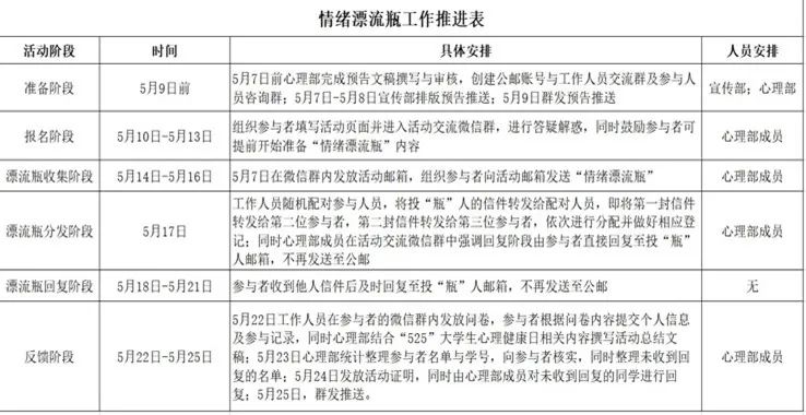 (1)4月10日带领心理部完成心理文化节系列活动“情绪漂流瓶”工作推进表。