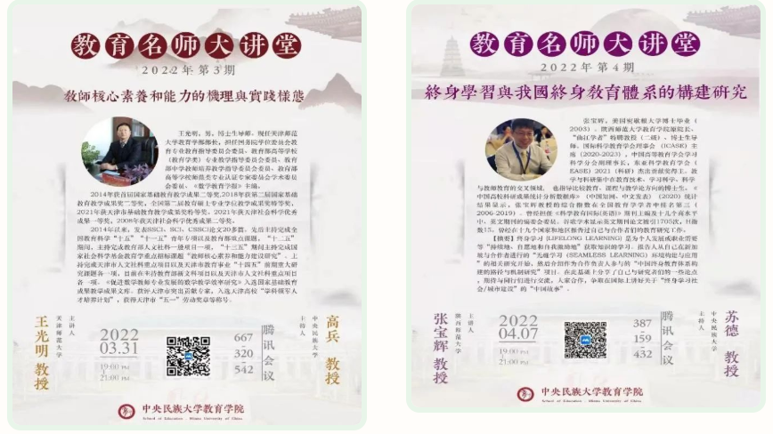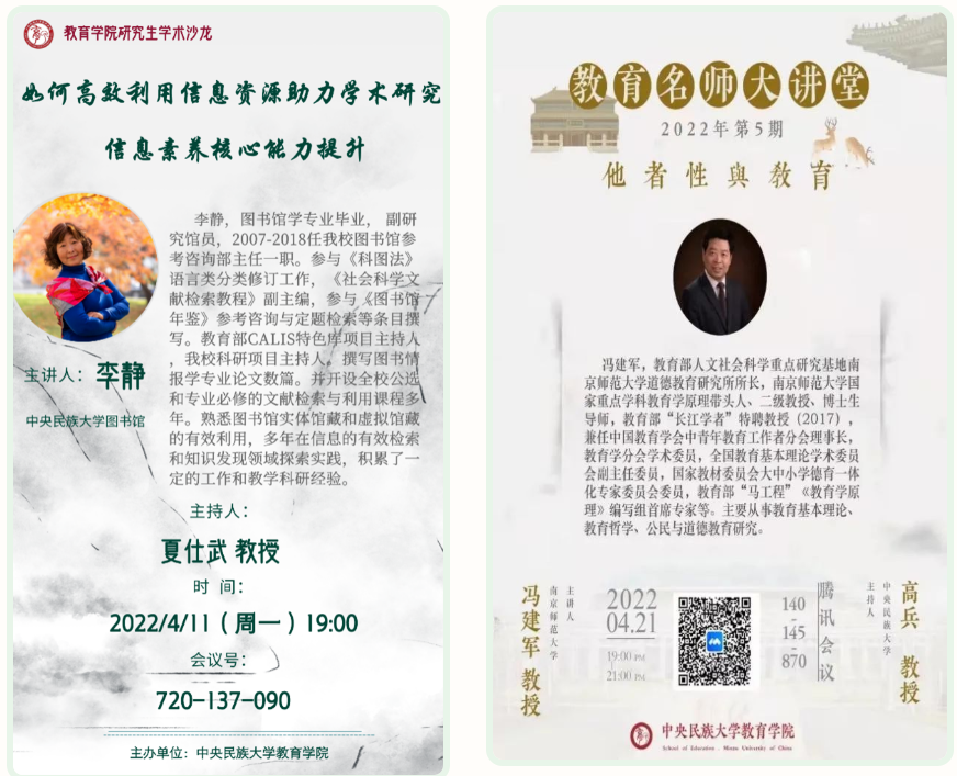 2.海报4个:教育名师大讲堂系列第三期海报、教育名师大讲堂系列第四期海报、学生学术工作系列讲座之william威廉中文官网图书馆李静老师讲《如何高效利用信息资源助力学术研究——信息素养核心能力提升》海报、教育名师大讲堂系列第五期海报。