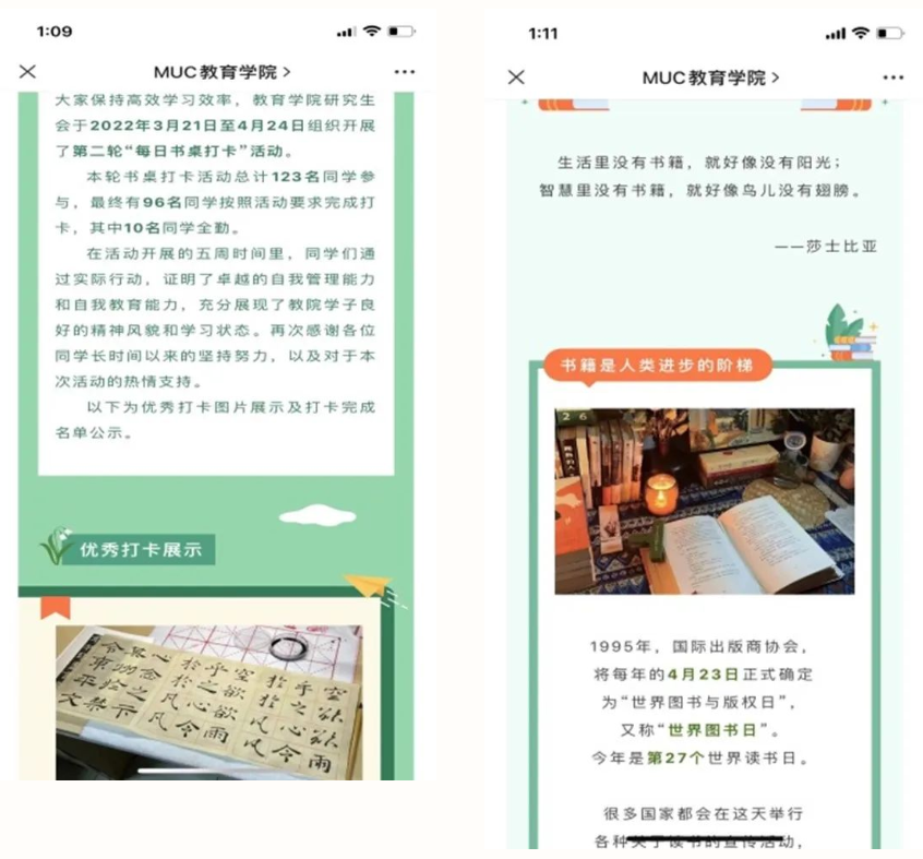 5.举办教育学院研究生第二轮“每日书桌打卡”活动。