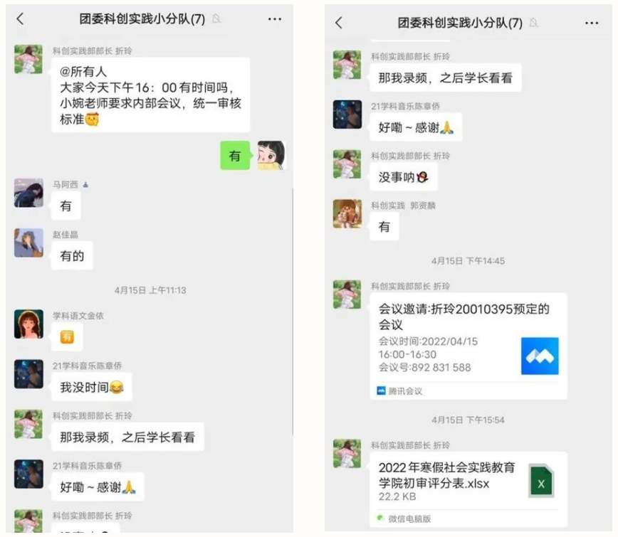 2022年4月15日,应团委书记王小婉老师要求,为促进寒假社会实践成果回收工作高效有序开展,团委科创实践部组织开展部门内部工作会议,明确寒假社会实践成果回收工作的要求与分工,促进本次寒假社会实践成果回收工作高效、高质量地完成。