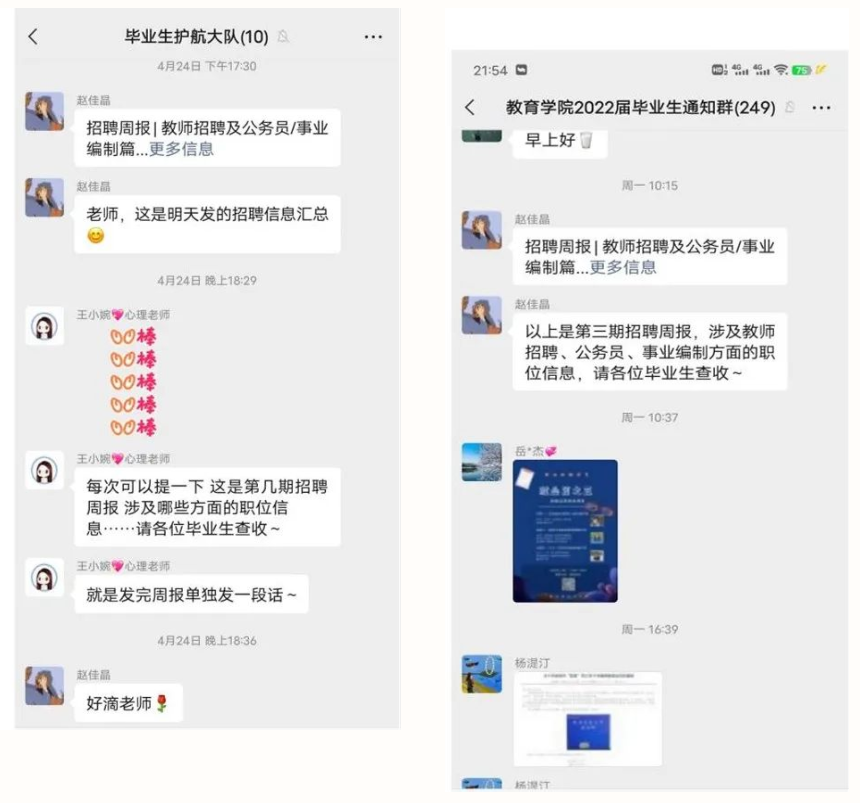 4、2022年四月以来,为促进我院毕业生顺利就业,团委科创实践部应学院要求,定期于教育学院2022届毕业生通知群中发布招聘周报,周报涉及就业讲座、企业招聘、事业编、公务员等的相关信息,截止本周,已发布七期招聘周报。在毕业生护航工作中,部门与学院老师积极配合形成合力,助力我院毕业生顺利就业。