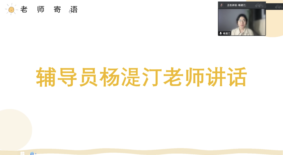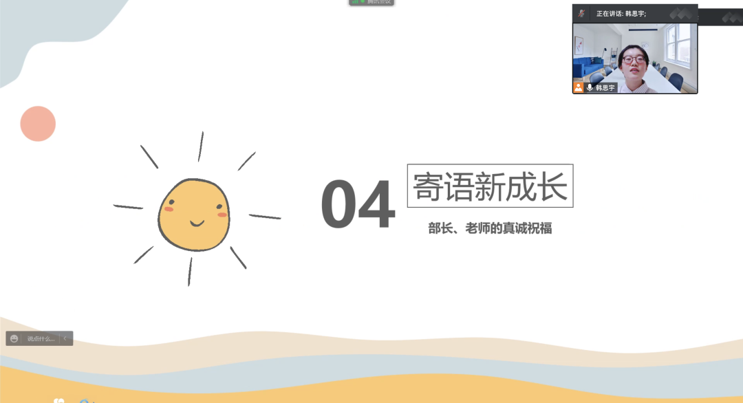 最后,本次会议的主持人韩思宇进行总结回顾并分享自己在团学组织的成长经历。主持人讲到,回顾本次会议,每个人都收获满满:在“光影回忆录”里,大家一起回顾了走过的点点滴滴;在“云端共分享”中,大家聆听了来自各个部门干事们的精彩汇报,共同见证了彼此的收获与成长;在“解忧‘心’驿站”中,团学组织的成员彼此敞开心扉,在答疑解惑中进一步增进了彼此间的了解与信任;在“寄语新成长”中,干事们真切地感受到了来自老师和学长学姐们对大家的关心与关爱,再次感受到了团学一家亲的温暖氛围!
