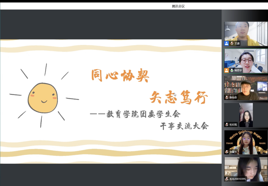 为进一步关注教育学院团委学生会干事们的成长,解决干事们在学习、工作、生活中遇到的问题,加强新老校区间的联系,探索两校区并行沟通联系机制,2022年5月12日晚19:30,教育学院第二十四届团委学生会组织召开“同心协契,矢志笃行”——教育学院团委学生会干事交流大会,主席团全体成员、10位部长、副部长以及全体干事齐聚云端,共享彼此的收获与成长感悟。教育学院党委副书记岳永杰老师、团委书记王小婉老师、辅导员杨湜汀老师莅临本次会议。会议由教育学院学生会执行主席韩思宇主持。