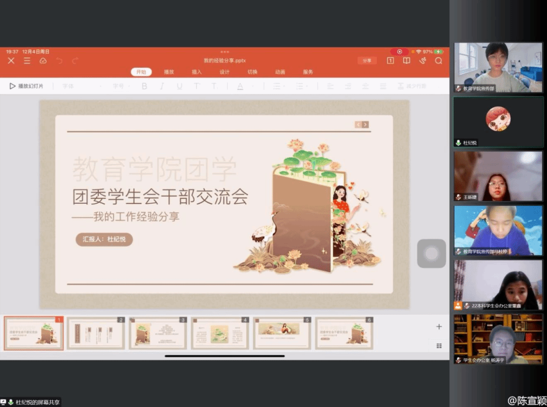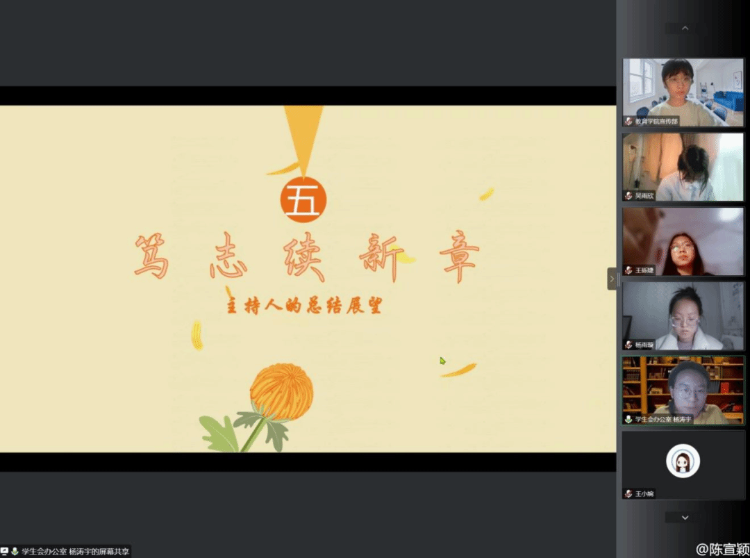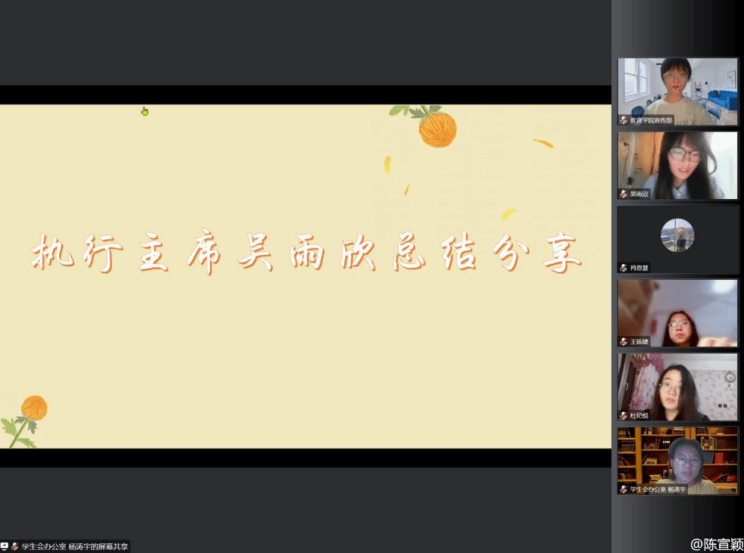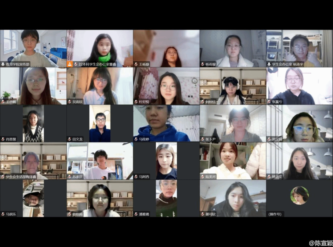 为促进教育学院团学干部间的沟通交流,解答团学干部的工作疑虑,提高团学干部的工作能力,增强教育学院团委学生会各部门间的凝聚力,教育学院第二十五届团委学生会于2022年12月4日晚19:30组织召开“同心协契,矢志笃行”——教育学院团委学生会干部交流会。团委书记王小婉老师、团委副书记、主席团全体成员、各部门负责人以及干事们齐聚云端,共享在团学组织中收获的温暖与感动。会议由学生会办公室负责人杨涛宇主持。