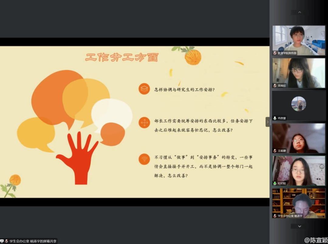 负责人们围绕工作提出的问题十分关键,主席团和其他负责人积极为大家答疑解惑,大家也都认真聆听,仔细记录。这是一次难得的主席团和负责人们工作经验的交流,具有较高的学习价值,让大家都受益匪浅。无论未来的日子如何,温暖的团学大家庭都会一起努力和奋斗,创造属于教院团学组织的未来。