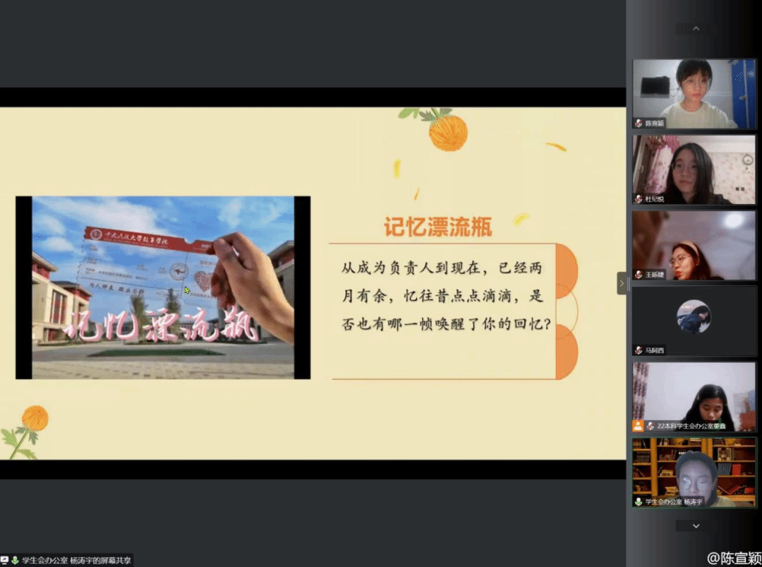主持人杨涛宇播放“记忆漂流瓶”短视频,带领大家回顾了部门负责人们本学期开学以来的工作经历。从开学团学招新活动,到每一期团学例会,再到举办的各项活动,负责人们在工作成长的每一寸足迹、付出的每一份努力都展现在教院团学工作回忆录里,让与会人员再次回忆起这一路的点点滴滴。