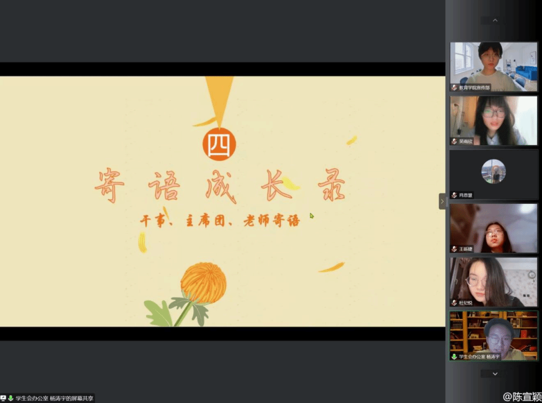 随后,主席团成员们也为各部门负责人送上了希冀与祝愿。她们同样制作了视频,分享了与大家或长或短的相处中感受到的他们一路以来的成长与蜕变。每一位成员都为学姐们的真诚与关切所感动,也为声声鼓励与祝福所鼓舞。相信在主席团成员的带领下,教育学院团委学生会将被注入源源动力,成为能力更强、素质更高的优质团学组织。